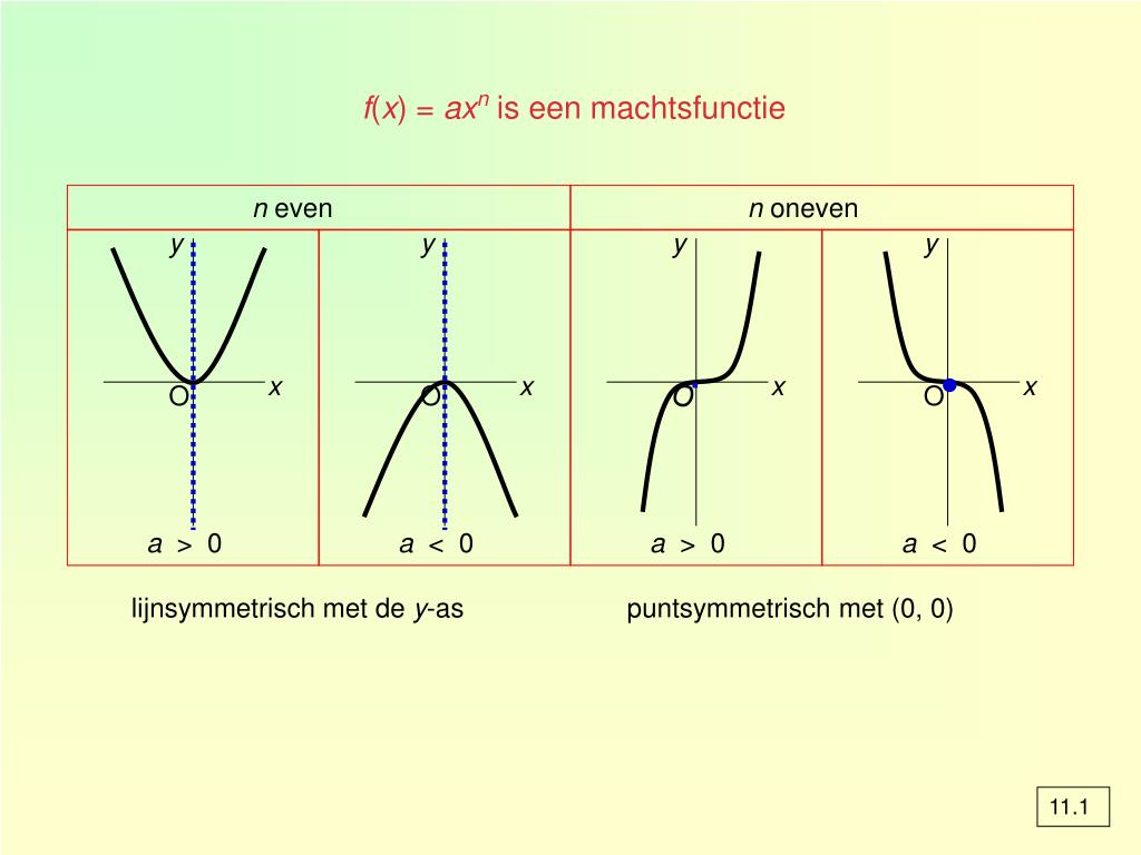 f ( x ) = ax n is een machtsfunctie. n even. n oneven. y. y. y. y. a > 0. a < 0. a > 0. a < 0. ∙. ∙. x. x. x. x. O. O. O. O. lijnsymmetrisch met de y -as. puntsymmetrisch met (0, 0). 11.1.
