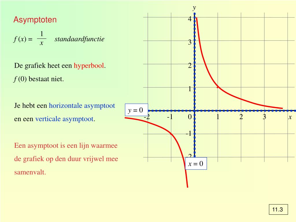 y 4 Asymptoten 1x f (x) = standaardfunctie De grafiek heet een hyperbool. f (0) bestaat niet. Je hebt een horizontale asymptoot en eenverticale asymptoot. Een asymptoot is een lijn waarmee de grafiek op den duur vrijwel mee samenvalt. 3 2 ∙ 1 y = 0 -2 -1 0 1 2 3 x ∙ -1 -2 x = 0 11.3