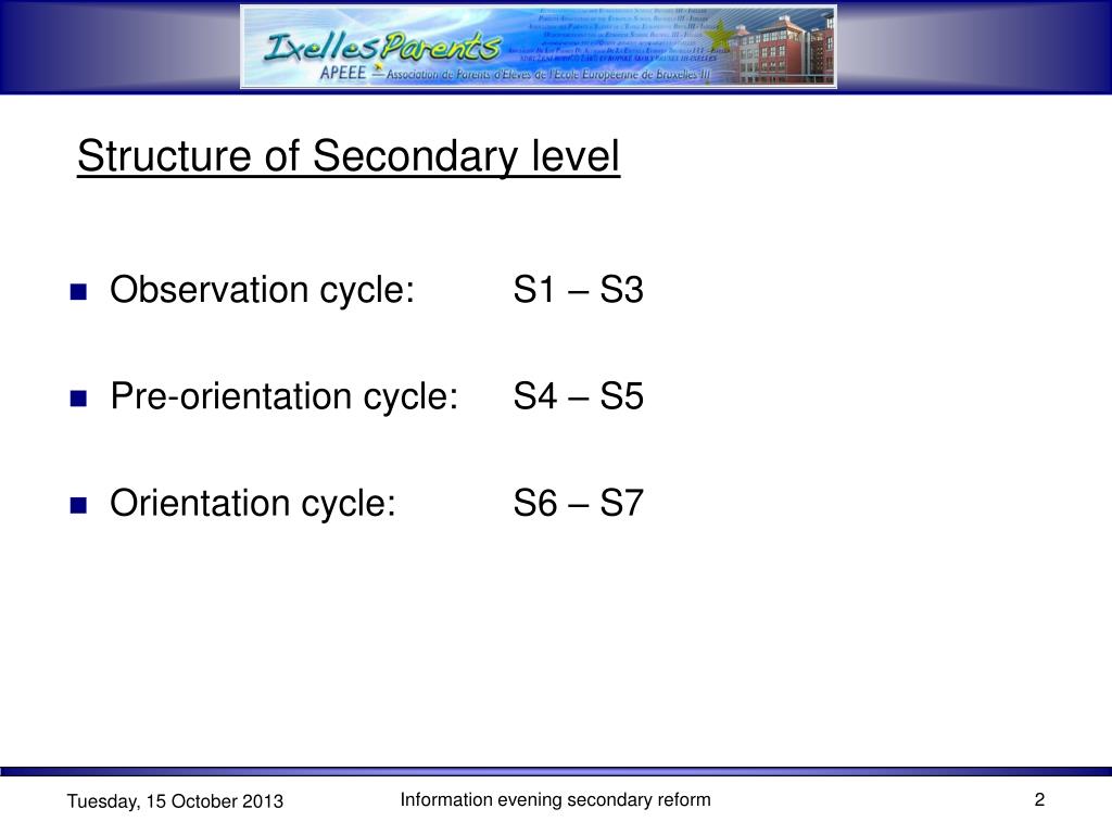APEEE BXL III. Information evening for parents on the Secondary Reform 15 October 2013, 19:30, Pupils Canteen. Welcome - Bienvenue. 1. Structure of Secondary level. Observation cycle: S1 – S3 Pre-orientation cycle: S4 – S5 Orientation cycle: S6 – S7. Current situation: S1 – S3.