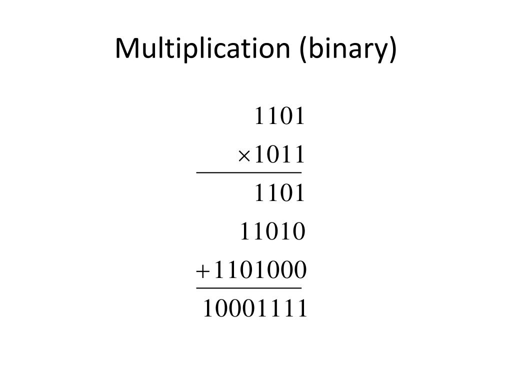Multiplication (binary) It’s interesting to note that binary multiplication is a sequence of shifts and adds of the first term (depending on the bits in the second term. 110100 is missing here because the corresponding bit in the second terms is 0.