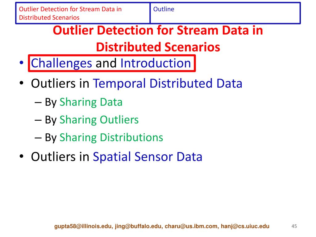 Outlier Detection for Stream Data in Distributed Scenarios • Challenges and Introduction • Outliers in Temporal Distributed Data • By Sharing Data • By Sharing Outliers • By Sharing Distributions • Outliers in Spatial Sensor Data gupta58@illinois.edu, jing@buffalo.edu, charu@us.ibm.com, hanj@cs.uiuc.edu Outline Outlier Detection for Stream Data in Distributed Scenarios