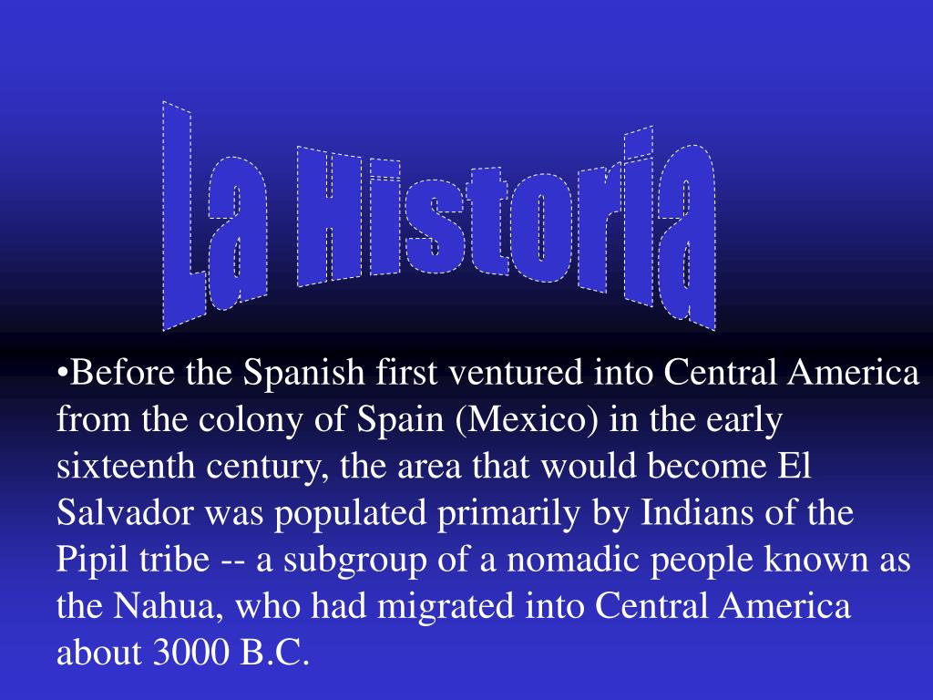 La Historia • Before the Spanish first ventured into Central America from the colony of Spain (Mexico) in the early sixteenth century, the area that would become El Salvador was populated primarily by Indians of the Pipil tribe -- a subgroup of a nomadic people known as the Nahua, who had migrated into Central America about 3000 B.C.