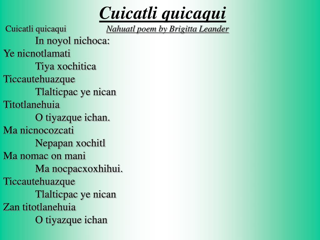 Cuicatli quicaquiCuicatli quicaqui Nahuatl poem by Brigitta Leander In noyol nichoca:Ye nicnotlamati Tiya xochiticaTiccautehuazque Tlalticpac ye nicanTitotlanehuia O tiyazque ichan.Ma nicnocozcati Nepapan xochitlMa nomac on mani Ma nocpacxoxhihui.Ticcautehuazque Tlalticpac ye nicanZan titotlanehuia O tiyazque ichan