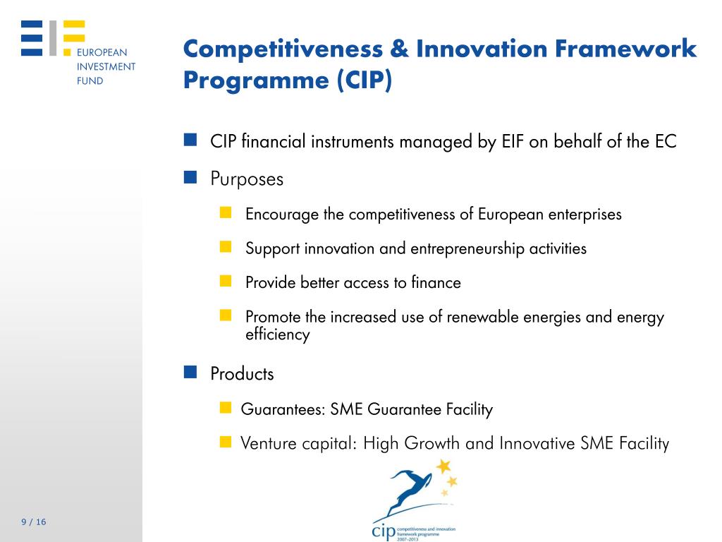 Competitiveness & Innovation Framework Programme (CIP) • CIP financial instruments managed by EIF on behalf of the EC • Purposes • Encourage the competitiveness of European enterprises • Support innovation and entrepreneurship activities • Provide better access to finance • Promote the increased use of renewable energies and energy efficiency • Products • Guarantees: SME Guarantee Facility • Venture capital: High Growth and Innovative SME Facility