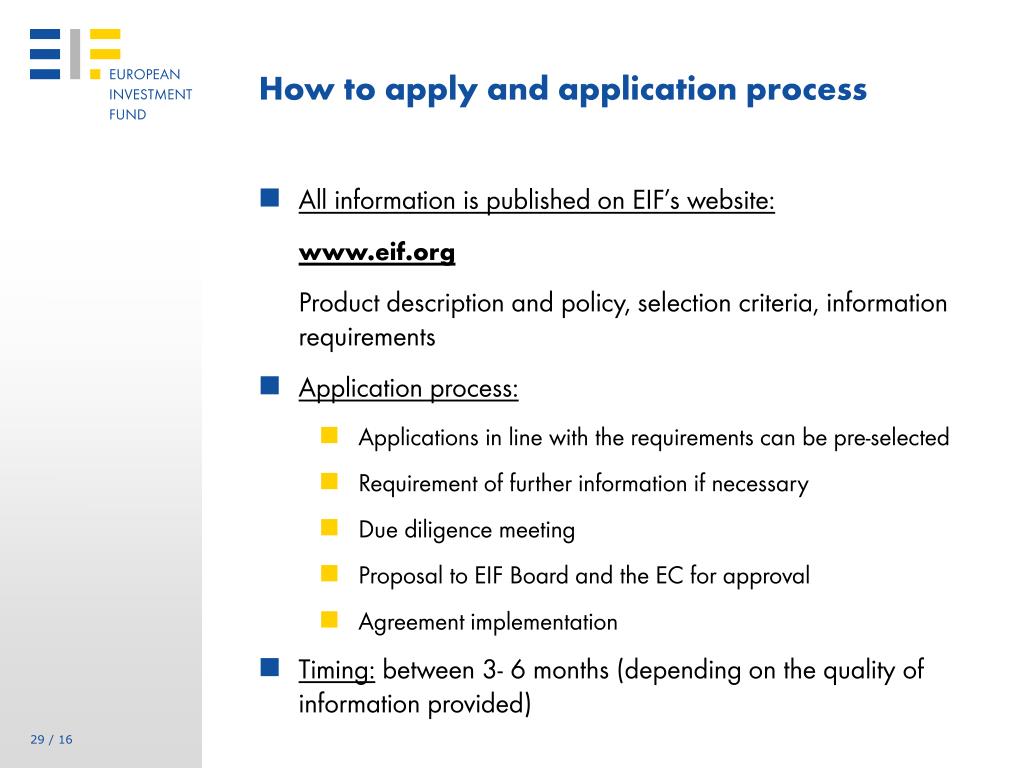 How to apply and application process • All information is published on EIF’s website: www.eif.org Product description and policy, selection criteria, information requirements • Application process: • Applications in line with the requirements can be pre-selected • Requirement of further information if necessary • Due diligence meeting • Proposal to EIF Board and the EC for approval • Agreement implementation • Timing: between 3- 6 months (depending on the quality of information provided)