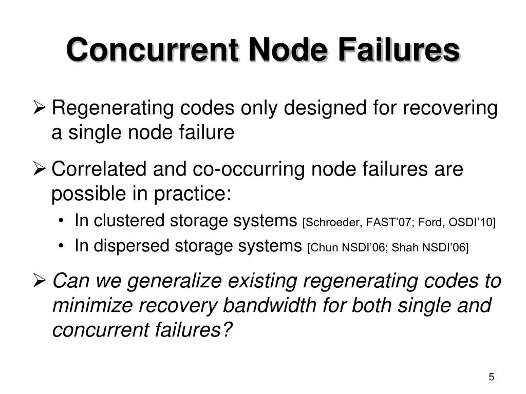 Concurrent Node Failures • Regenerating codes only designed for recovering a single node failure • Correlated and co-occurring node failures are possible in practice: • In clustered storage systems [Schroeder, FAST’07; Ford, OSDI’10] • In dispersed storage systems [Chun NSDI’06; Shah NSDI’06] • Can we generalize existing regenerating codes to minimize recovery bandwidth for both single and concurrent failures?