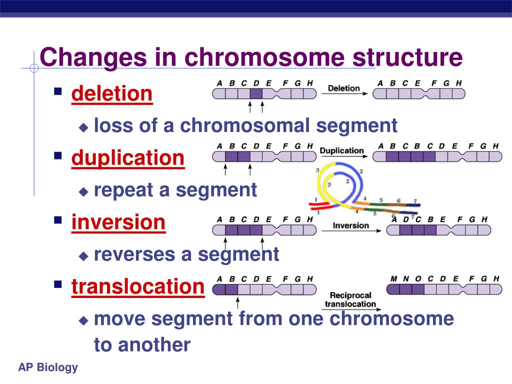 Changes in chromosome structure • deletion • loss of a chromosomal segment • duplication • repeat a segment • inversion • reverses a segment • translocation • move segment from one chromosome to another