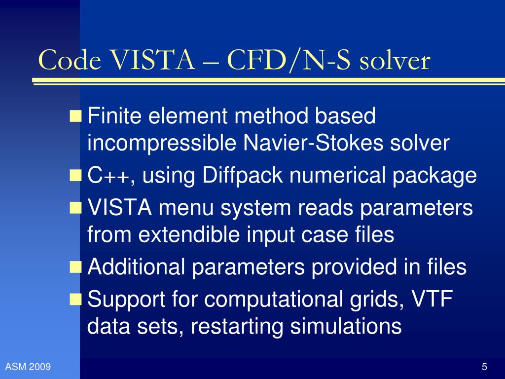 Code VISTA – CFD/N-S solver • Finite element method based incompressible Navier-Stokes solver • C++, using Diffpack numerical package • VISTA menu system reads parameters from extendible input case files • Additional parameters provided in files • Support for computational grids, VTF data sets, restarting simulations