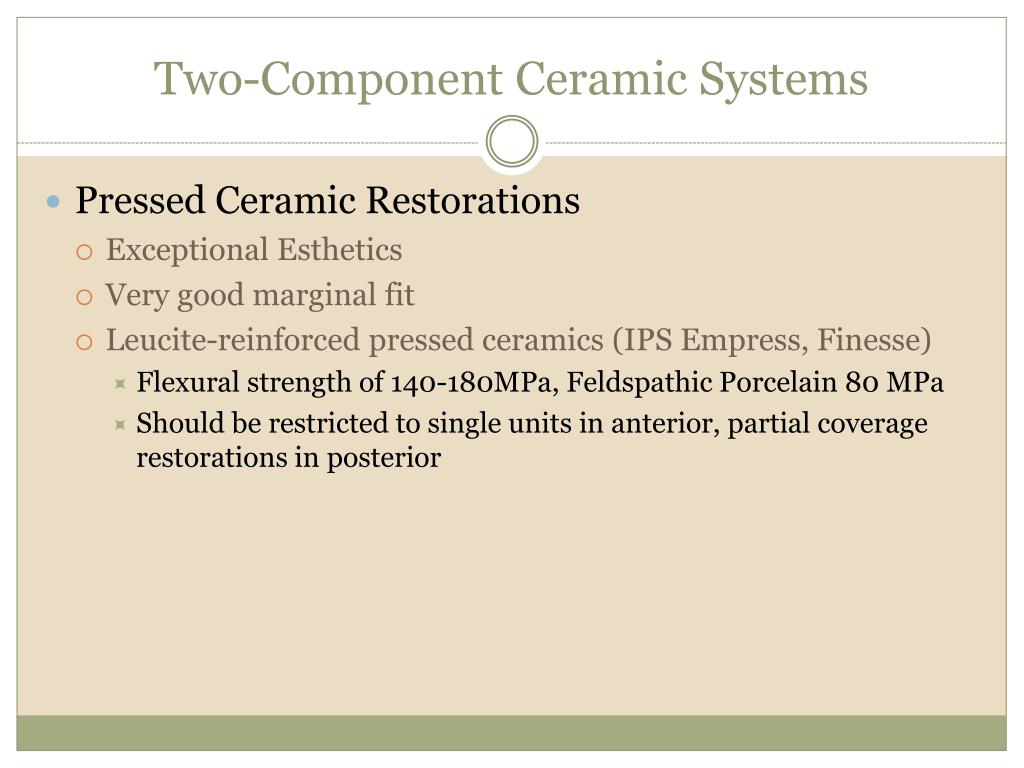Two-Component Ceramic Systems • Pressed Ceramic Restorations • Exceptional Esthetics • Very good marginal fit • Leucite-reinforced pressed ceramics (IPS Empress, Finesse) • Flexural strength of 140-180MPa, Feldspathic Porcelain 80 MPa • Should be restricted to single units in anterior, partial coverage restorations in posterior