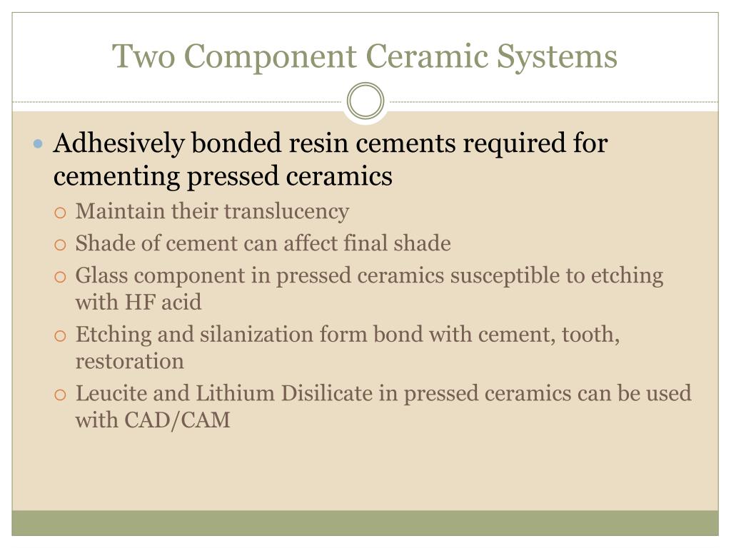 Two Component Ceramic Systems • Adhesively bonded resin cements required for cementing pressed ceramics • Maintain their translucency • Shade of cement can affect final shade • Glass component in pressed ceramics susceptible to etching with HF acid • Etching and silanization form bond with cement, tooth, restoration • Leucite and Lithium Disilicate in pressed ceramics can be used with CAD/CAM