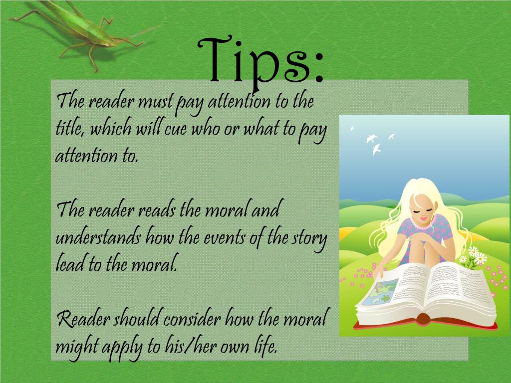 Tips: The reader must pay attention to the title, which will cue who or what to pay attention to. The reader reads the moral and understands how the events of the story lead to the moral. Reader should consider how the moral might apply to his/her own life.