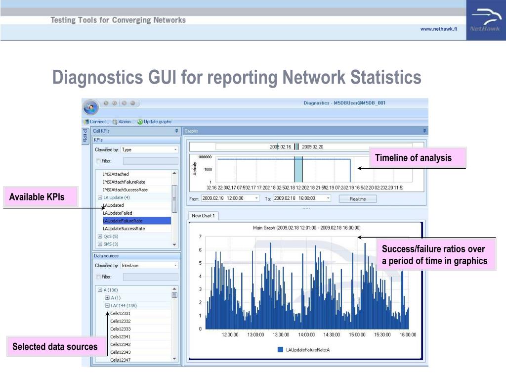 Diagnostics GUI for reporting Network Statistics Timeline of analysis Available KPIs Success/failure ratios over a period of time in graphics Selected data sources