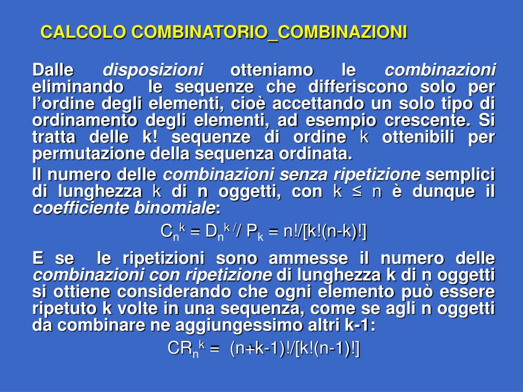 CALCOLO COMBINATORIO_COMBINAZIONI Dalle disposizioni otteniamo le combinazioni eliminando le sequenze che differiscono solo per l’ordine degli elementi, cioè accettando un solo tipo di ordinamento degli elementi, ad esempio crescente. Si tratta delle k! sequenze di ordine k ottenibili per permutazione della sequenza ordinata. Il numero delle combinazioni senza ripetizione semplici di lunghezza k di n oggetti, con k ≤ n è dunque il coefficiente binomiale: Cnk = Dnk // Pk = n!/[k!(n-k)!] E se le ripetizioni sono ammesse il numero delle combinazioni con ripetizione di lunghezza k di n oggetti si ottiene considerando che ogni elemento può essere ripetuto k volte in una sequenza, come se agli n oggetti da combinare ne aggiungessimo altri k-1: CRnk = (n+k-1)!/[k!(n-1)!]