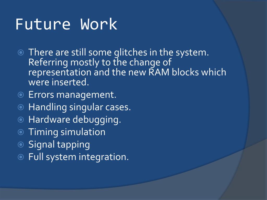 Future Work • There are still some glitches in the system. Referring mostly to the change of representation and the new RAM blocks which were inserted. • Errors management. • Handling singular cases. • Hardware debugging. • Timing simulation • Signal tapping • Full system integration.