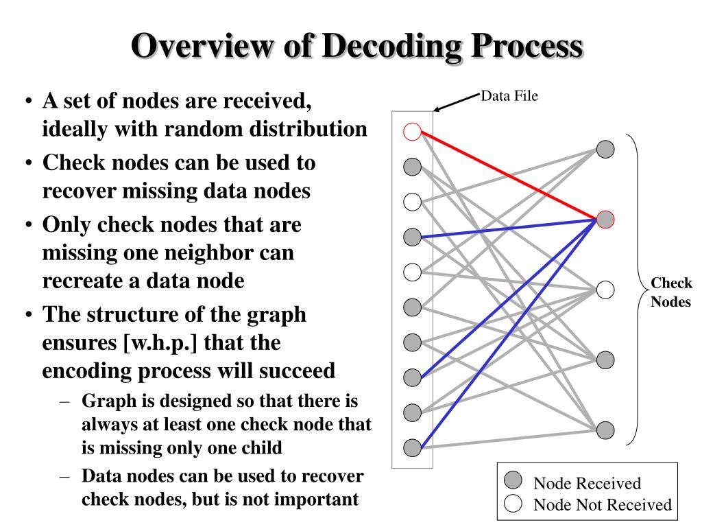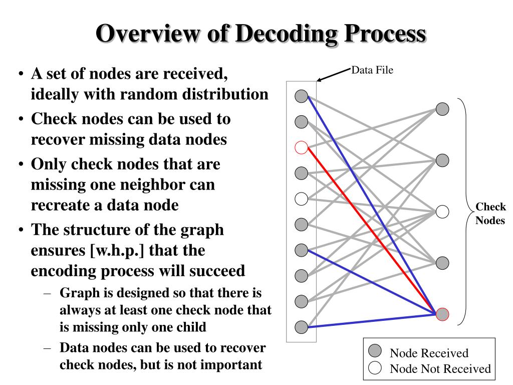 Overview of Decoding Process Data File • A set of nodes are received, ideally with random distribution • Check nodes can be used to recover missing data nodes • Only check nodes that are missing one neighbor can recreate a data node • The structure of the graph ensures [w.h.p.] that the encoding process will succeed • Graph is designed so that there is always at least one check node that is missing only one child • Data nodes can be used to recover check nodes, but is not important Check Nodes Node Received Node Not Received