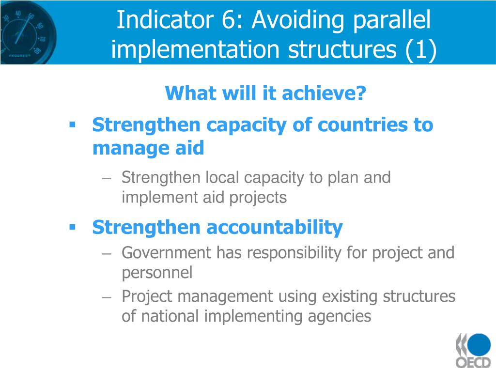 Indicator 6: Avoiding parallel implementation structures (1) What will it achieve? • Strengthen capacity of countries to manage aid • Strengthen local capacity to plan and implement aid projects • Strengthen accountability • Government has responsibility for project and personnel • Project management usingexisting structures of national implementingagencies