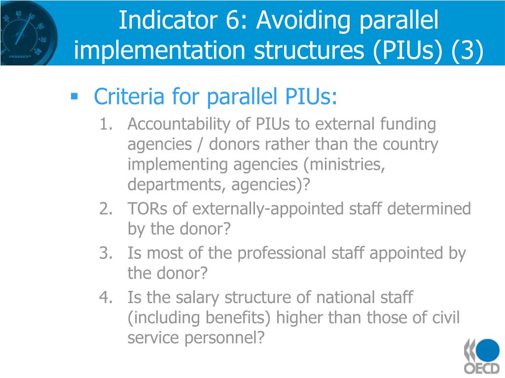 Indicator 6: Avoiding parallel implementation structures (PIUs) (3) • Criteria for parallel PIUs: • Accountability of PIUs to external funding agencies / donors rather than the country implementing agencies (ministries, departments, agencies)? • TORs of externally-appointed staff determined by the donor? • Is most of the professional staff appointed by the donor? • Is the salary structure of national staff (including benefits) higher than those of civil service personnel?