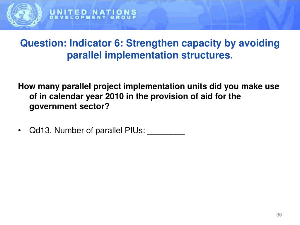 Question: Indicator 6: Strengthen capacity by avoiding parallel implementation structures. How many parallel project implementation units did you make use of in calendar year 2010 in the provision of aid for the government sector? • Qd13. Number of parallel PIUs: ________