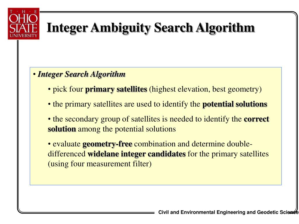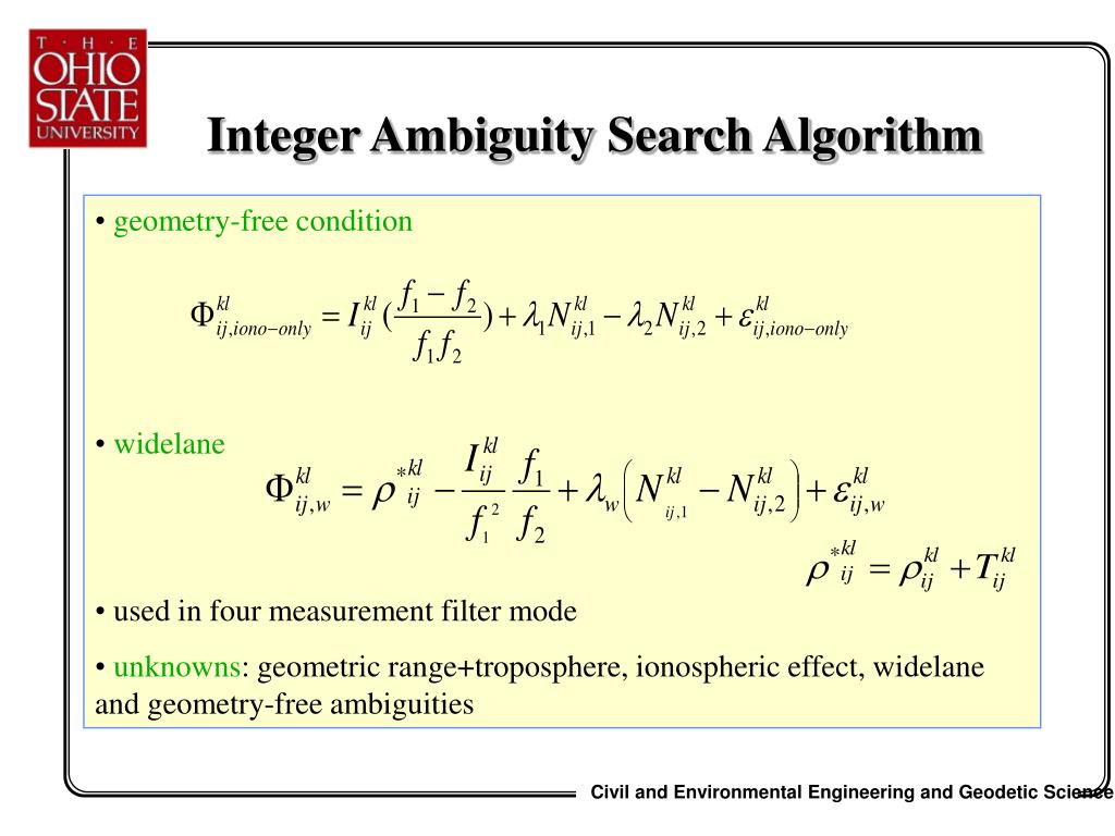 Integer Ambiguity Search Algorithm • geometry-free condition • widelane • used in four measurement filter mode • unknowns: geometric range+troposphere, ionospheric effect, widelane and geometry-free ambiguities