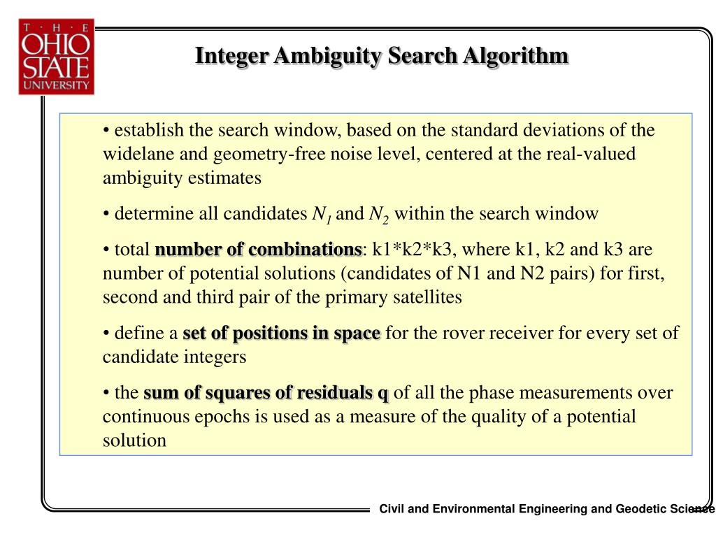 Integer Ambiguity Search Algorithm • establish the search window, based on the standard deviations of the widelane and geometry-free noise level, centered at the real-valued ambiguity estimates • determine all candidates N1and N2 within the search window • total number of combinations: k1*k2*k3, where k1, k2 and k3 are number of potential solutions (candidates of N1 and N2 pairs) for first, second and third pair of the primary satellites • define a set of positions in space for the rover receiver for every set of candidate integers • the sum of squares of residuals q of all the phase measurements over continuous epochs is used as a measure of the quality of a potential solution