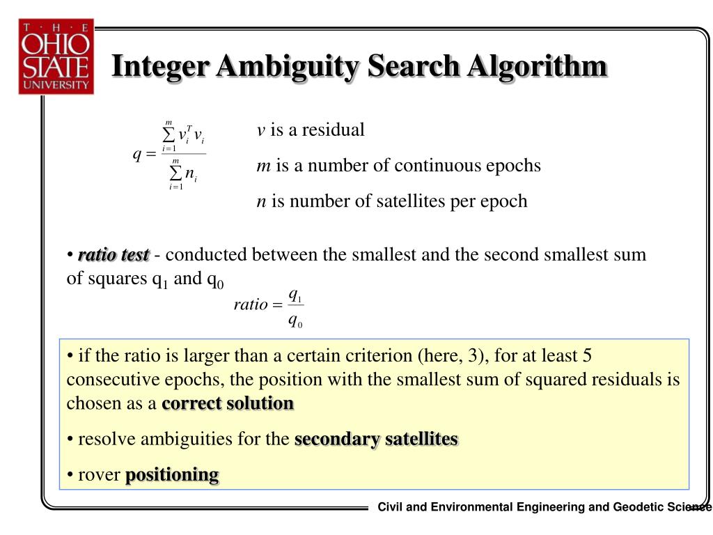 Integer Ambiguity Search Algorithm v is a residual m is a number of continuous epochs n is number of satellites per epoch • ratio test - conducted between the smallest and the second smallest sum of squares q1 and q0 • if the ratio is larger than a certain criterion (here, 3), for at least 5 consecutive epochs, the position with the smallest sum of squared residuals is chosen as a correct solution • resolve ambiguities for the secondary satellites • rover positioning