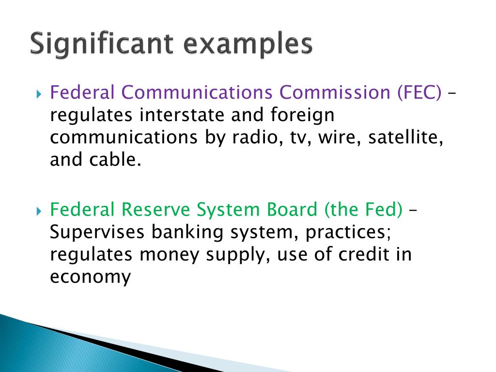 Significant examples • Federal Communications Commission (FEC) – regulates interstate and foreign communications by radio, tv, wire, satellite, and cable. • Federal Reserve System Board (the Fed) – Supervises banking system, practices; regulates money supply, use of credit in economy