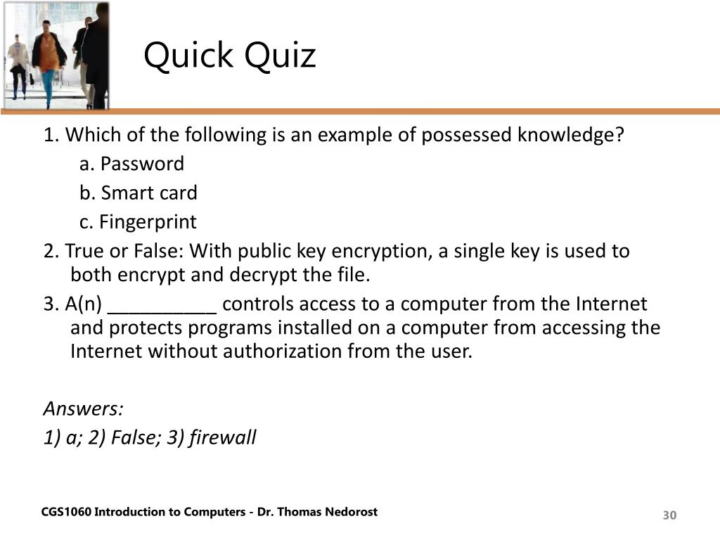 Quick Quiz 1. Which of the following is an example of possessed knowledge? a. Password b. Smart card c. Fingerprint 2. True or False: With public key encryption, a single key is used to both encrypt and decrypt the file. 3. A(n) __________ controls access to a computer from the Internet and protects programs installed on a computer from accessing the Internet without authorization from the user. Answers: 1) a; 2) False; 3) firewall CGS1060 Introduction to Computers - Dr. Thomas Nedorost