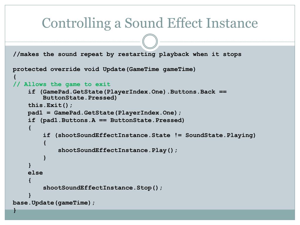 Controlling a Sound Effect Instance //makes the sound repeat by restarting playback when it stops protected override void Update(GameTimegameTime) { // Allows the game to exit if (GamePad.GetState(PlayerIndex.One).Buttons.Back == ButtonState.Pressed) this.Exit(); pad1 = GamePad.GetState(PlayerIndex.One); if (pad1.Buttons.A == ButtonState.Pressed) { if (shootSoundEffectInstance.State != SoundState.Playing) { shootSoundEffectInstance.Play(); } } else { shootSoundEffectInstance.Stop(); } base.Update(gameTime); }