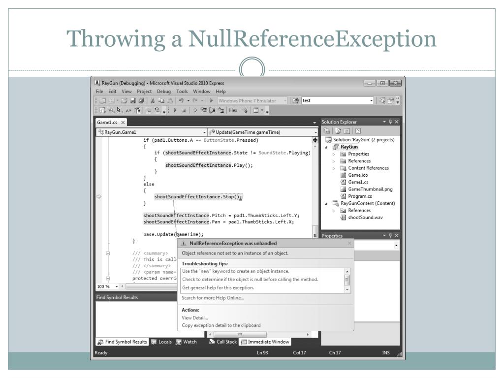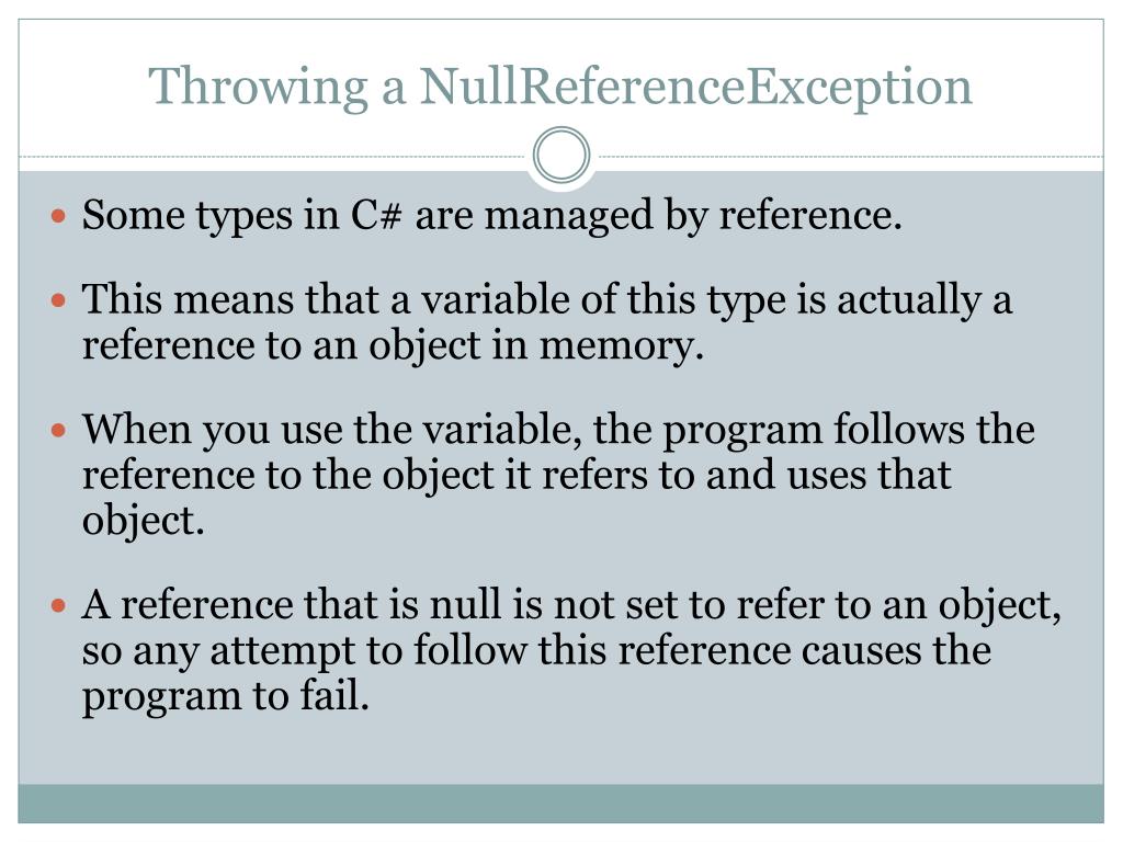Throwing a NullReferenceException • Some types in C# are managed by reference. • This means that a variable of this type is actually a reference to an object in memory. • When you use the variable, the program follows the reference to the object it refers to and uses that object. • A reference that is null is not set to refer to an object, so any attempt to follow this reference causes the program to fail.