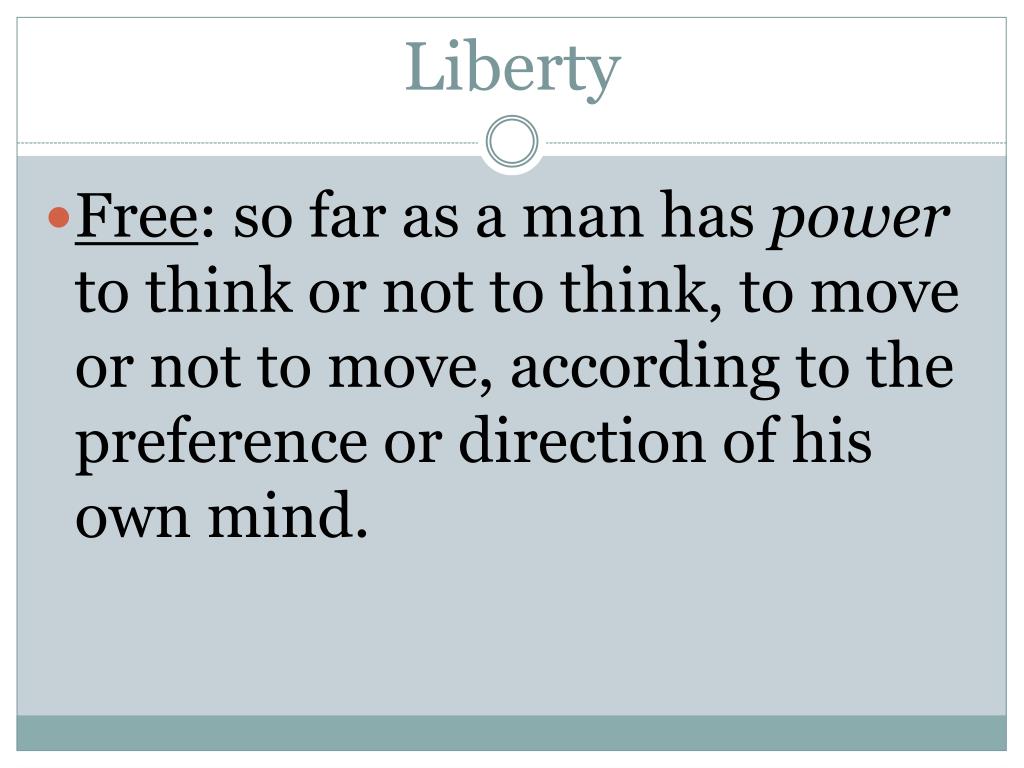 Liberty Free: so far as a man has power to think or not to think, to move or not to move, according to the preference or direction of his own mind.