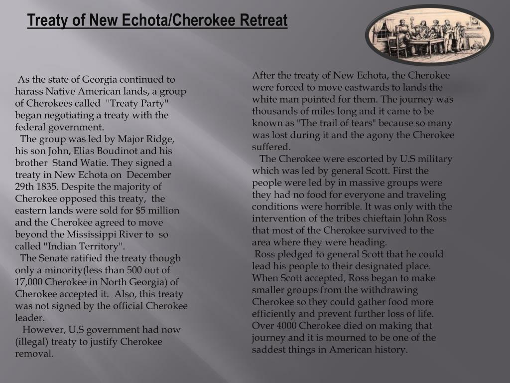 Treaty of New Echota/Cherokee Retreat After the treaty of New Echota, the Cherokee were forced to move eastwards to lands the white man pointed for them. The journey was thousands of miles long and it came to be known as "The trail of tears" because so many was lost during it and the agony the Cherokee suffered.The Cherokee were escorted by U.S military which was led by general Scott. First the people were led by in massive groups were they had no food for everyone and traveling conditions were horrible. It was only with the intervention of the tribes chieftain John Ross that most of the Cherokee survived to the area where they were heading. Ross pledged to general Scott that he could lead his people to their designated place. When Scott accepted, Ross began to make smaller groups from the withdrawing Cherokee so they could gather food more efficiently and prevent further loss of life. Over 4000 Cherokee died on making that journey and it is mourned to be one of the saddest things in American history. As the state of Georgia continued to harass Native American lands, a group of Cherokees called ''Treaty Party'' began negotiating a treaty with the federal government. The group was led by Major Ridge, his son John, Elias Boudinot and his brother Stand Watie. They signed a treaty in New Echota on December 29th 1835. Despite the majority of Cherokee opposed this treaty, the eastern lands were sold for $5 million and the Cherokee agreed to move beyond the Mississippi River to so called ''Indian Territory''. The Senate ratified the treaty though only a minority(less than 500 out of 17,000 Cherokee in North Georgia) of Cherokee accepted it. Also, this treaty was not signed by the official Cherokee leader. However, U.S government had now (illegal) treaty to justify Cherokee removal.