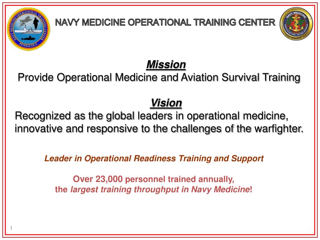 NAVY MEDICINE OPERATIONAL TRAINING CENTER. Mission Provide Operational Medicine and Aviation Survival Training Vision Recognized as the global leaders in operational medicine, innovative and responsive to the challenges of the warfighter .
