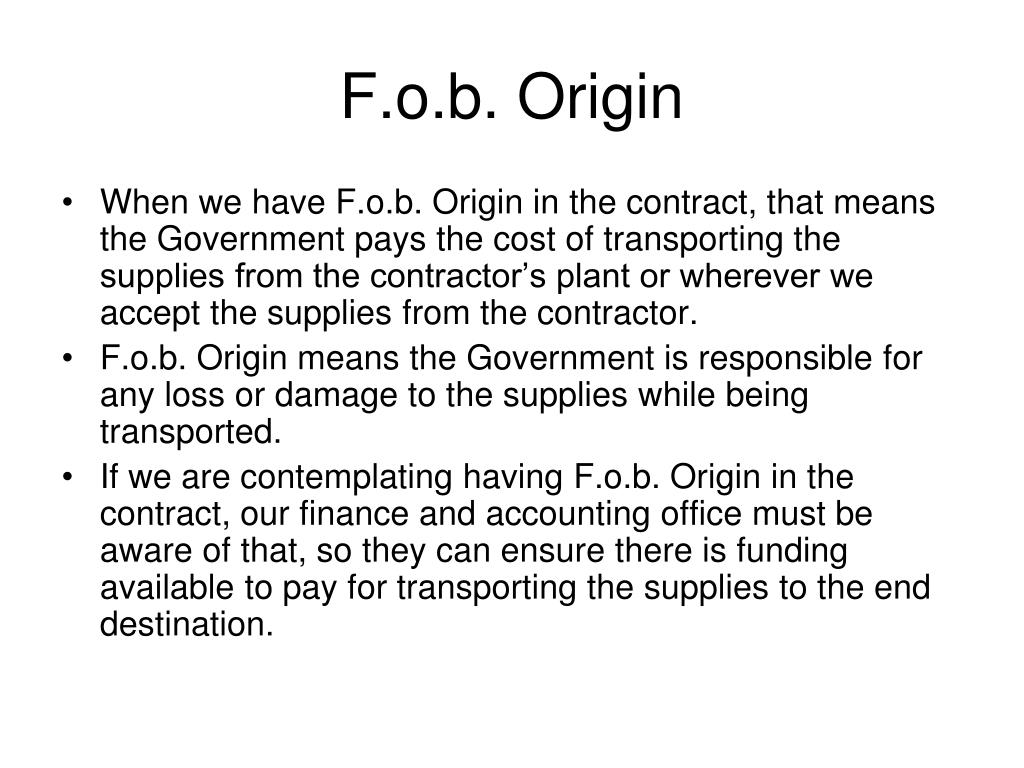 F.o.b. Origin • When we have F.o.b. Origin in the contract, that means the Government pays the cost of transporting the supplies from the contractor’s plant or wherever we accept the supplies from the contractor. • F.o.b. Origin means the Government is responsible for any loss or damage to the supplies while being transported. • If we are contemplating having F.o.b. Origin in the contract, our finance and accounting office must be aware of that, so they can ensure there is funding available to pay for transporting the supplies to the end destination.