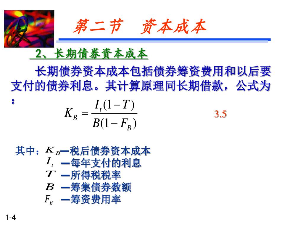 3.5 其中: —税后债券资本成本 —每年支付的利息 —所得税税率 —筹集债券数额 —筹资费用率 第二节 资本成本 2、长期债券资本成本 长期债券资本成本包括债券筹资费用和以后要支付的债券利息。其计算原理同长期借款,公式为: