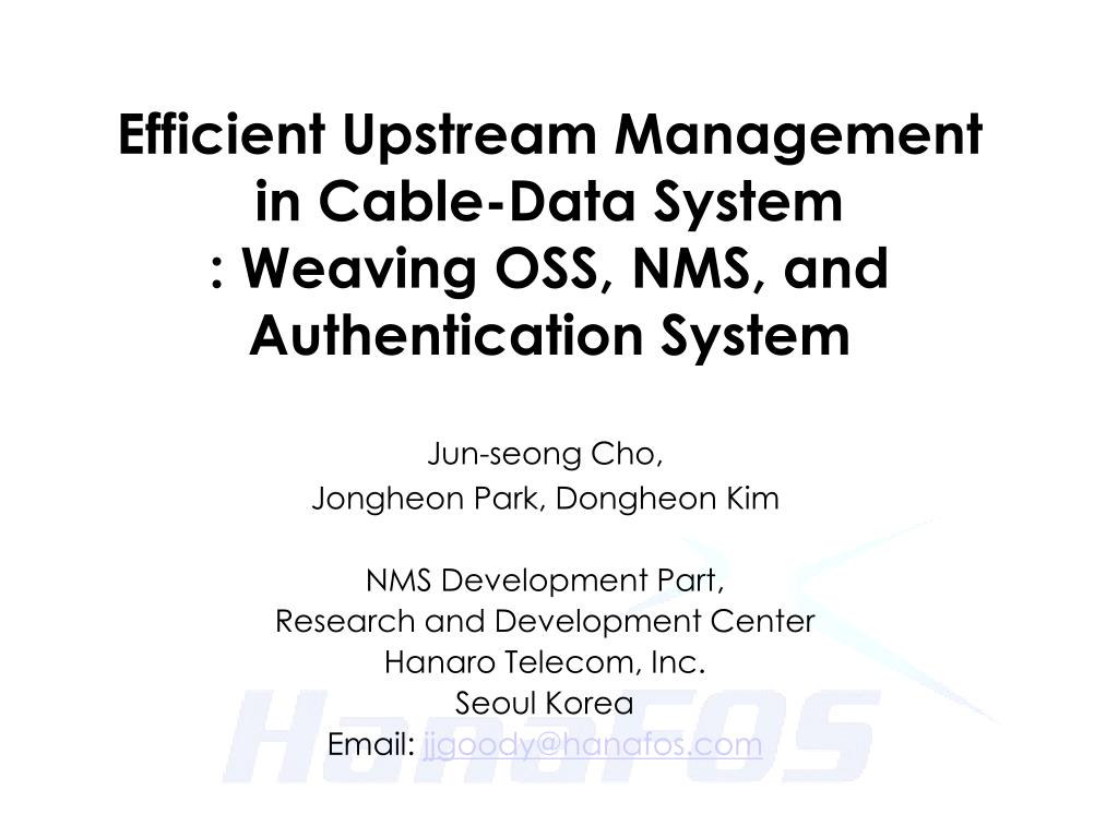 Efficient Upstream Management in Cable-Data System : Weaving OSS, NMS, and Authentication System. Jun-seong Cho, Jongheon Park, Dongheon Kim NMS Development Part, Research and Development Center Hanaro Telecom, Inc. Seoul Korea Email: jjgoody@hanafos.com. Introduction.