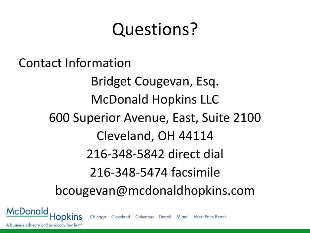 Questions? Contact Information Bridget Cougevan, Esq. McDonald Hopkins LLC 600 Superior Avenue, East, Suite 2100 Cleveland, OH 44114 216-348-5842 direct dial 216-348-5474 facsimile bcougevan@mcdonaldhopkins.com