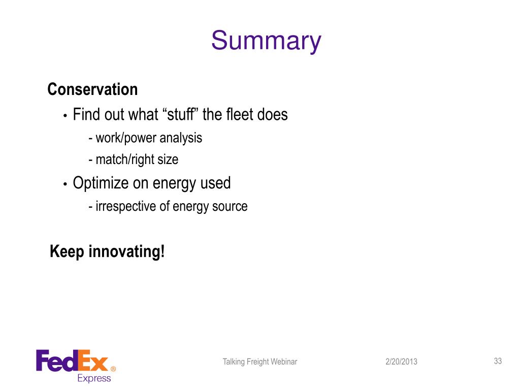 Summary Talking Freight Webinar Conservation • Find out what “stuff” the fleet does - work/power analysis - match/right size • Optimize on energy used - irrespective of energy source Keep innovating!