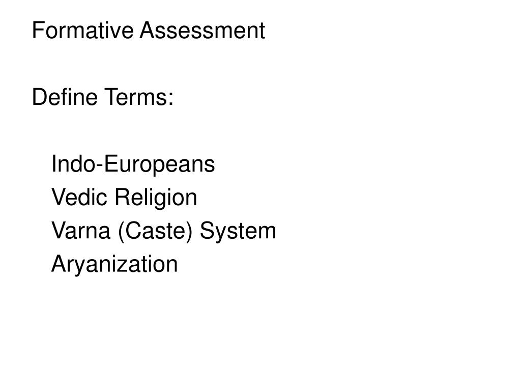 Formative Assessment Define Terms: Indo-Europeans Vedic Religion Varna (Caste) System Aryanization