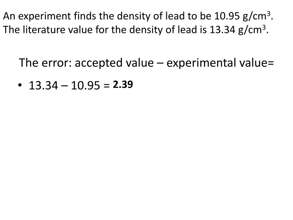 An experiment finds the density of lead to be 10.95 g/cm3. The literature value for the density of lead is 13.34 g/cm3. The error: accepted value – experimental value= • 13.34 – 10.95 = 2.39