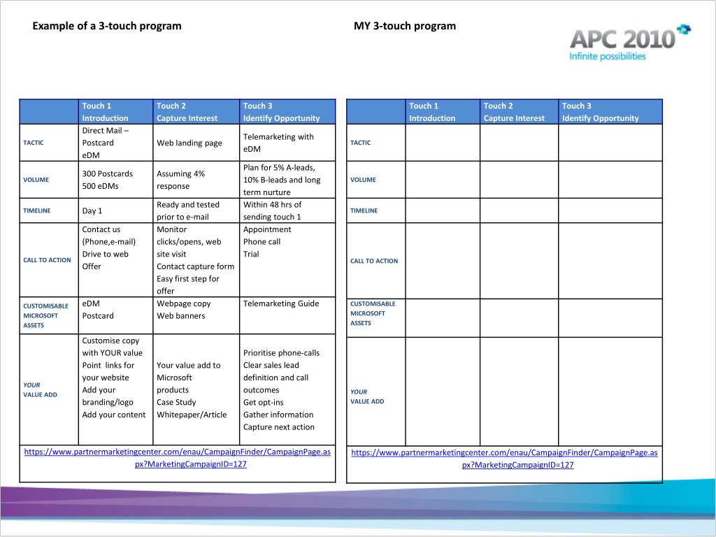 Lead Generation ………..out of the box Running a customer acquisition campaign - Get to market fast with repurposed Microsoft assets - Plan for sales objectives and multiple customer interactions - Make execution easy with minimum preparation time