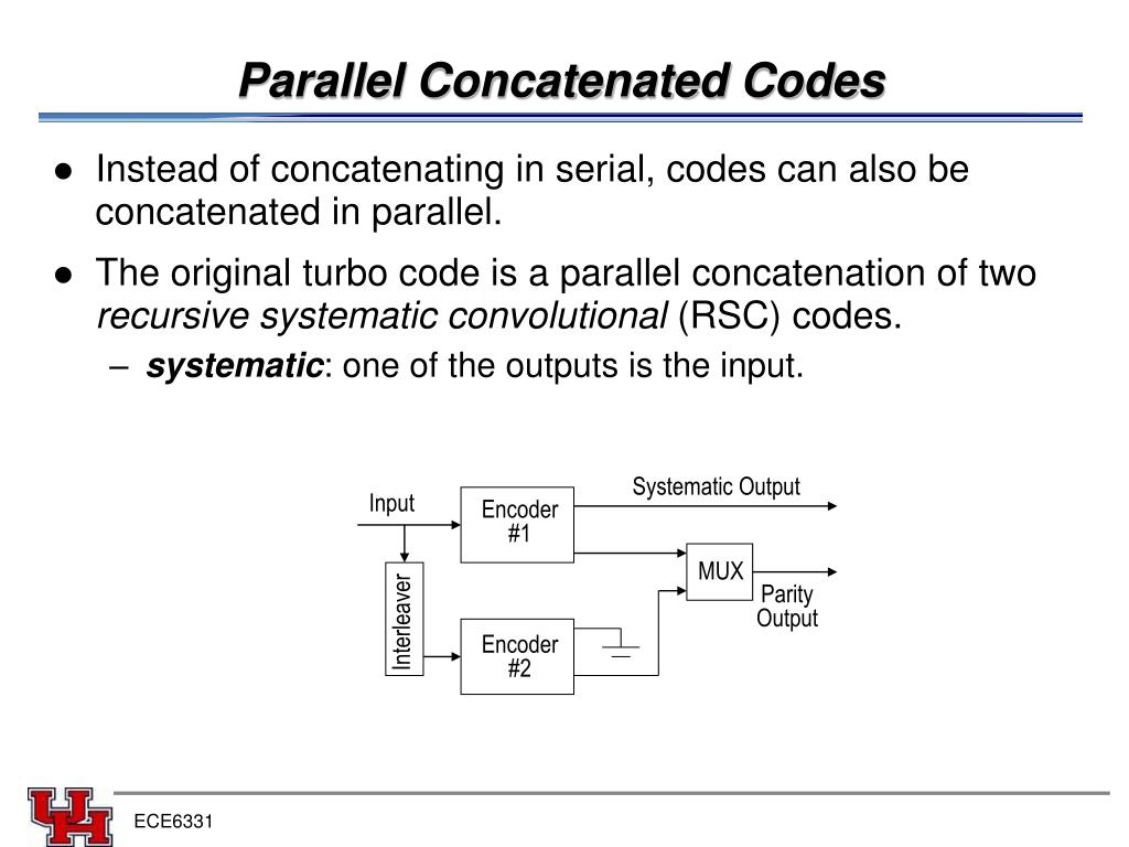 Parallel Concatenated Codes • Instead of concatenating in serial, codes can also be concatenated in parallel. • The original turbo code is a parallel concatenation of two recursive systematic convolutional (RSC) codes. • systematic: one of the outputs is the input. Systematic Output Input Encoder #1 MUX Parity Output Interleaver Encoder #2 ECE6331