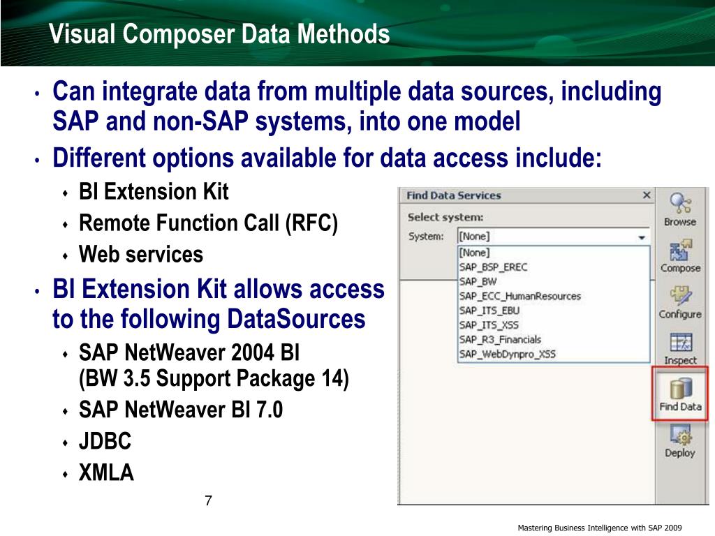 Visual Composer Data Methods • Can integrate data from multiple data sources, including SAP and non-SAP systems, into one model • Different options available for data access include: • BI Extension Kit • Remote Function Call (RFC) • Web services • BI Extension Kit allows access to the following DataSources • SAP NetWeaver 2004 BI (BW 3.5 Support Package 14) • SAP NetWeaver BI 7.0 • JDBC • XMLA