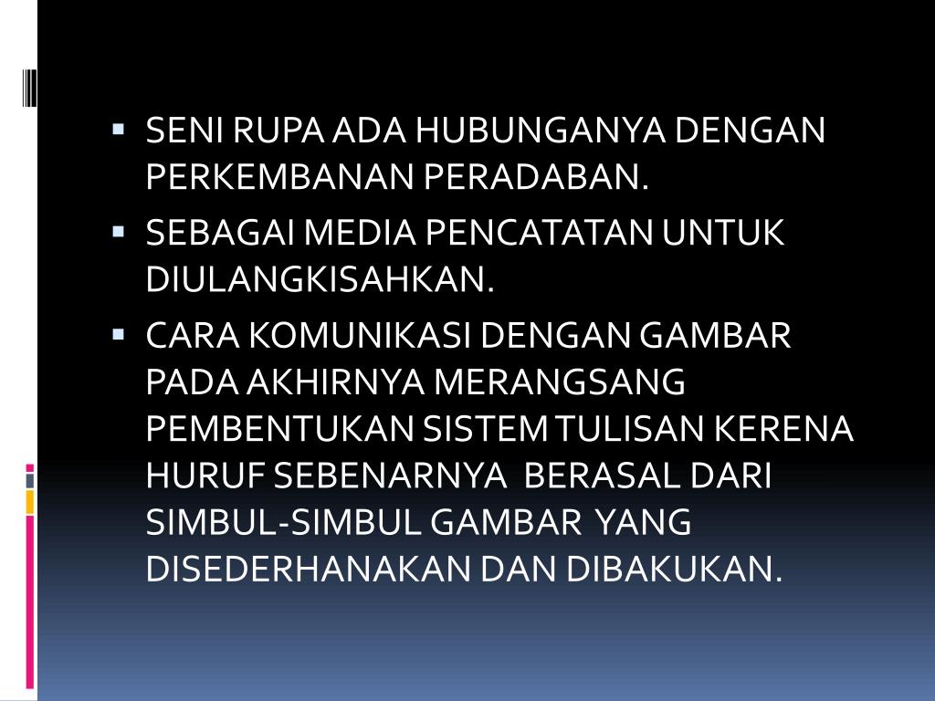 SENI RUPA ADA HUBUNGANYA DENGAN PERKEMBANAN PERADABAN. • SEBAGAI MEDIA PENCATATAN UNTUK DIULANGKISAHKAN. • CARA KOMUNIKASI DENGAN GAMBAR PADA AKHIRNYA MERANGSANG PEMBENTUKAN SISTEM TULISAN KERENA HURUF SEBENARNYA BERASAL DARI SIMBUL-SIMBUL GAMBAR YANG DISEDERHANAKAN DAN DIBAKUKAN.