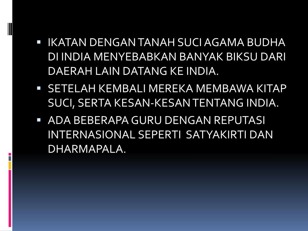 IKATAN DENGAN TANAH SUCI AGAMA BUDHA DI INDIA MENYEBABKAN BANYAK BIKSU DARI DAERAH LAIN DATANG KE INDIA. • SETELAH KEMBALI MEREKA MEMBAWA KITAP SUCI, SERTA KESAN-KESAN TENTANG INDIA. • ADA BEBERAPA GURU DENGAN REPUTASI INTERNASIONAL SEPERTI SATYAKIRTI DAN DHARMAPALA.