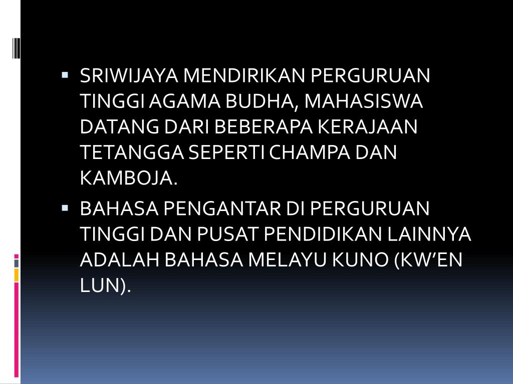 SRIWIJAYA MENDIRIKAN PERGURUAN TINGGI AGAMA BUDHA, MAHASISWA DATANG DARI BEBERAPA KERAJAAN TETANGGA SEPERTI CHAMPA DAN KAMBOJA. • BAHASA PENGANTAR DI PERGURUAN TINGGI DAN PUSAT PENDIDIKAN LAINNYA ADALAH BAHASA MELAYU KUNO (KW’EN LUN).
