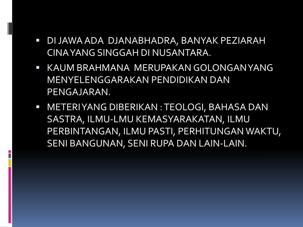 DI JAWA ADA DJANABHADRA, BANYAK PEZIARAH CINA YANG SINGGAH DI NUSANTARA. • KAUM BRAHMANA MERUPAKAN GOLONGAN YANG MENYELENGGARAKAN PENDIDIKAN DAN PENGAJARAN. • METERI YANG DIBERIKAN : TEOLOGI, BAHASA DAN SASTRA, ILMU-LMU KEMASYARAKATAN, ILMU PERBINTANGAN, ILMU PASTI, PERHITUNGAN WAKTU, SENI BANGUNAN, SENI RUPA DAN LAIN-LAIN.