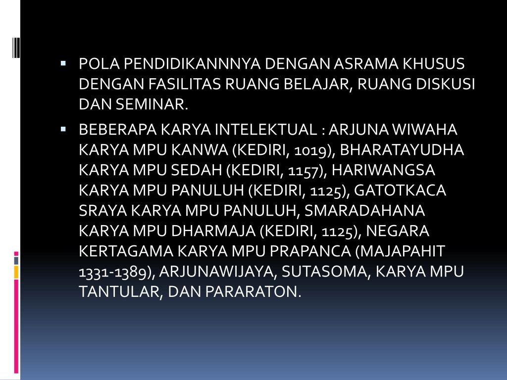 POLA PENDIDIKANNNYA DENGAN ASRAMA KHUSUS DENGAN FASILITAS RUANG BELAJAR, RUANG DISKUSI DAN SEMINAR. • BEBERAPA KARYA INTELEKTUAL : ARJUNA WIWAHA KARYA MPU KANWA (KEDIRI, 1019), BHARATAYUDHA KARYA MPU SEDAH (KEDIRI, 1157), HARIWANGSA KARYA MPU PANULUH (KEDIRI, 1125), GATOTKACA SRAYA KARYA MPU PANULUH, SMARADAHANA KARYA MPU DHARMAJA (KEDIRI, 1125), NEGARA KERTAGAMA KARYA MPU PRAPANCA (MAJAPAHIT 1331-1389), ARJUNAWIJAYA, SUTASOMA, KARYA MPU TANTULAR, DAN PARARATON.