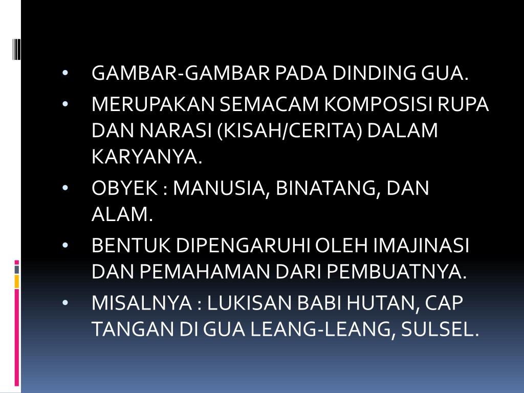 GAMBAR-GAMBAR PADA DINDING GUA. • MERUPAKAN SEMACAM KOMPOSISI RUPA DAN NARASI (KISAH/CERITA) DALAM KARYANYA. • OBYEK : MANUSIA, BINATANG, DAN ALAM. • BENTUK DIPENGARUHI OLEH IMAJINASI DAN PEMAHAMAN DARI PEMBUATNYA. • MISALNYA : LUKISAN BABI HUTAN, CAP TANGAN DI GUA LEANG-LEANG, SULSEL.