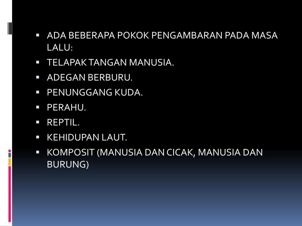 ADA BEBERAPA POKOK PENGAMBARAN PADA MASA LALU: • TELAPAK TANGAN MANUSIA. • ADEGAN BERBURU. • PENUNGGANG KUDA. • PERAHU. • REPTIL. • KEHIDUPAN LAUT. • KOMPOSIT (MANUSIA DAN CICAK, MANUSIA DAN BURUNG)