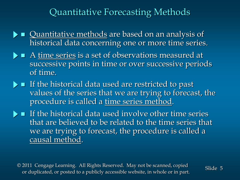 Quantitative Forecasting Methods • Quantitative methods are based on an analysis of historical data concerning one or more time series. • A time series is a set of observations measured at successive points in time or over successive periods of time. • If the historical data used are restricted to past values of the series that we are trying to forecast, the procedure is called a time series method. • If the historical data used involve other time series that are believed to be related to the time series that we are trying to forecast, the procedure is called a causal method.